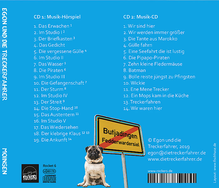 Das Bundle besteht aus:1 (verfügbares) T-Shirt nach Wahl1 “Moinsen” Patch1 Doppel-CD “Moinsen” (Lieder + Hörspiel)