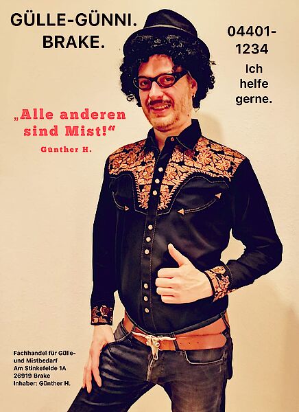 Gülle-Günni heißt eigentlich Günther Haufen und ist der Bruder von Hinnerk Haufen. Anders als Hinnerk hat Günni allerdings Karriere gemacht und führt erfolgreich sein Großhandel-Geschäft “Gülle und Mist - Fachhandel für Gülle- und Mistbedarf” in Brake. Günni spielt nicht bei uns mit taucht aber auf Plakaten oder in Form von Anekdoten immer wieder bei unseren Konzerten auf. Günni isst gerne Frikadelle ohne Senf.